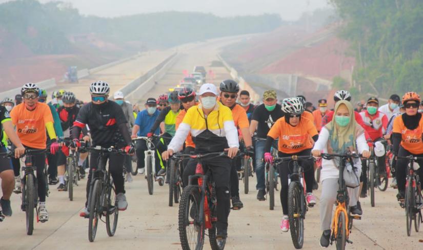 Bengkulu - Gubernur Bengkulu Rohidin Mersyah Sambil Fun Bike Bersama unsur Forum Koordinasi Pimpinan Daerah (Forkopimda), para Kepala Organisasi Perangkat Daerah (OPD) di jajaran Pemprov Bengkulu pantau progres pembangunan Jalan Tol Trans Sumatera Bengkulu- Curup- Lubuk Linggau, dengan cara Fun Bike bersama sepanjang 6 Km.