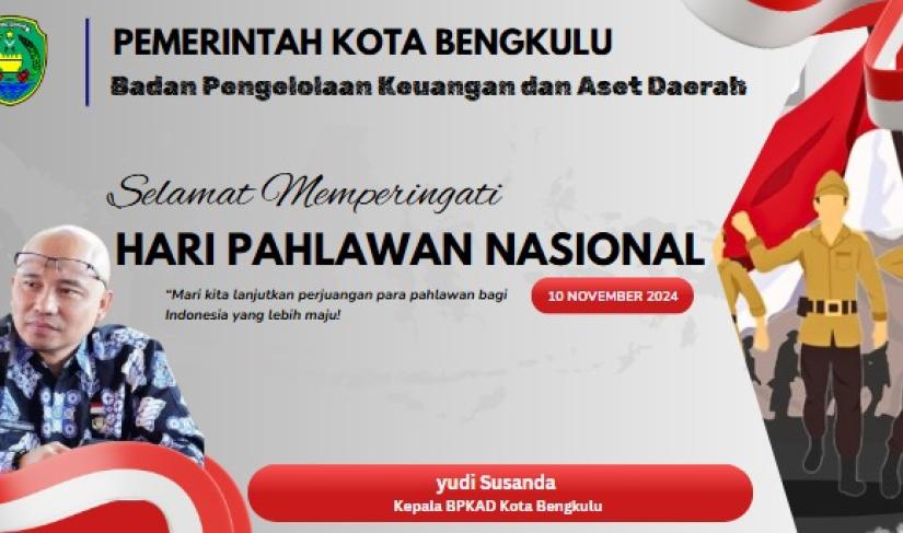 BENGKULU - Kepala Badan Pengelolaan Keuangan dan Aset Daerah (BPKAD) Kota Bengkulu, Yudi Susanda, turut menyampaikan ucapan selamat memperingati Hari Pahlawan Nasional yang jatuh pada 10 November 2024. Ia mengajak seluruh masyarakat, khususnya Aparatur Sipil Negara (ASN) di lingkungan BPKAD, untuk menjadikan semangat kepahlawanan sebagai inspirasi dalam menjalankan tugas sehari-hari.