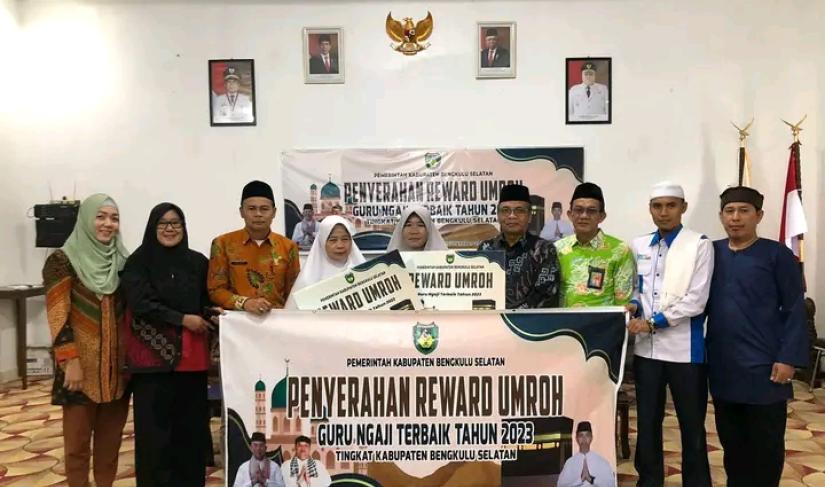 Penarafflesia.com - Pemerintah Kabupaten Bengkulu Selatan memberikan penghargaan kepada dua orang guru ngaji dengan memberikan voucher umroh. Penyerahan simbolis reward ini dilakukan oleh Asisten Administrasi Pemerintahan dan Kesra, Isran Kasiri, S.IP, di Aula Balai Sekundang Rumah Dinas Bupati Bengkulu Selatan, Jl. Maria Affan Manna pada Kamis (26/10).